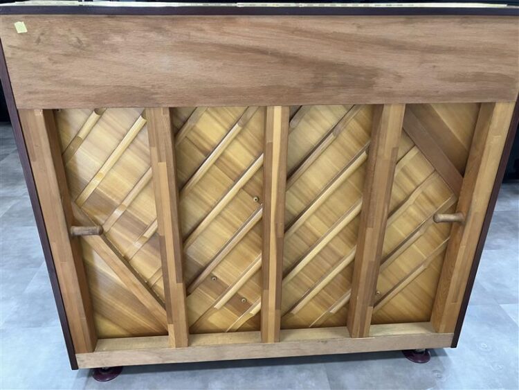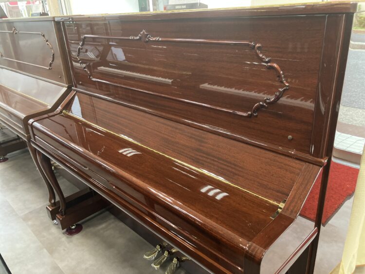 木目が美しいマホガニー外装の中古ピアノが入荷しました。上前板の装飾と猫脚のやわらかな雰囲気が特徴的です。比較的新しいシリーズで、明るく華やかな音質です。鍵盤蓋がゆっくり閉まるソフトランディング機構を採用していますので、小さなお子さんも安心してご利用いただけます。
